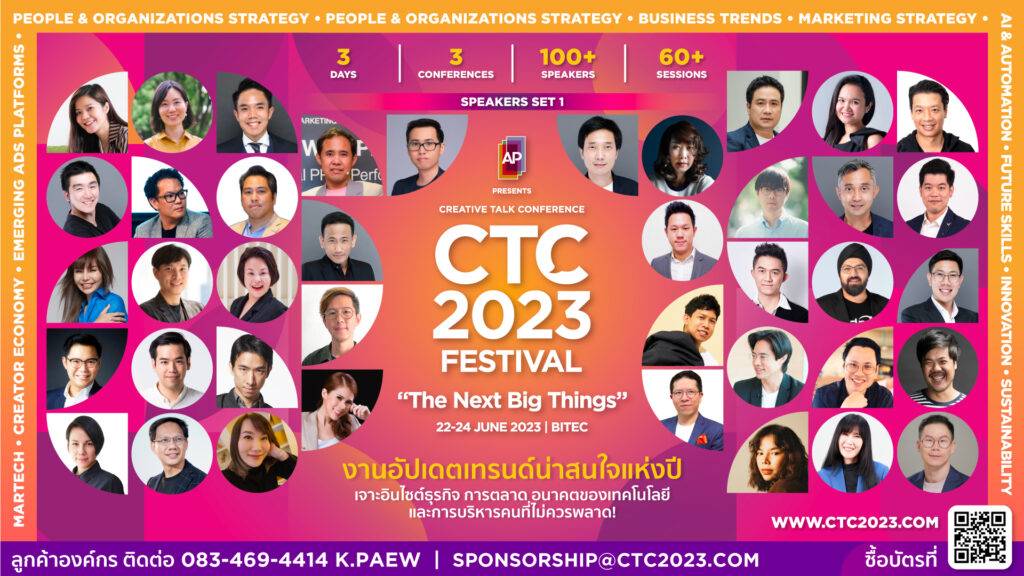 CREATIVE TALK CONFERENCE 2023 FESTIVAL (CTC2023 FESTIVAL) งานอัปเดตเทรนด์น่าสนใจแห่งปี เจาะอินไซต์ธุรกิจ การตลาด อนาคตของเทคโนโลยี และการบริหารคนที่ไม่ควรพลาด ภายใต้ธีมของ ‘The Next Big Things’ สิ่งสำคัญที่ยิ่งใหญ่ที่กำลังจะเกิดขึ้นต่อไปในอนาคตอันใกล้ เราอยากชวนทุกคนมาร่วมพูดคุย แชร์ไอเดีย และแบ่งปันความรู้ถึงสิ่งที่หลายคนมองว่าจะเป็น Big things ที่จะเปลี่ยนชีวิตและการทำงานของเรา