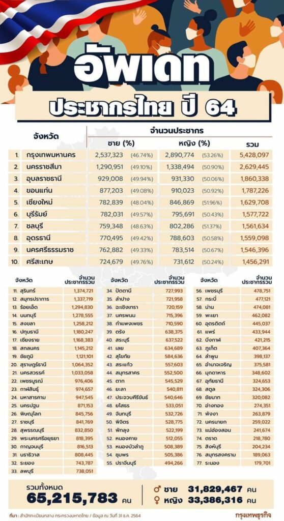 สรุปยอดประชากรชาวไทย ประจำปี 2565 (ข้อมูลเมื่อวันที่ 31 ธ.ค. 2564) ประเทศไทยมีประชากรรวมทั้งหมด 65,215,783 คน โดยพบว่ามีประชากรหญิงมีจำนวนมากกว่ามากกว่าประชากรชาย โดยประชากรหญิง มีจำนวน 33,386,316 คน และประชากรชาย มีจำนวน 31,829,467 คน