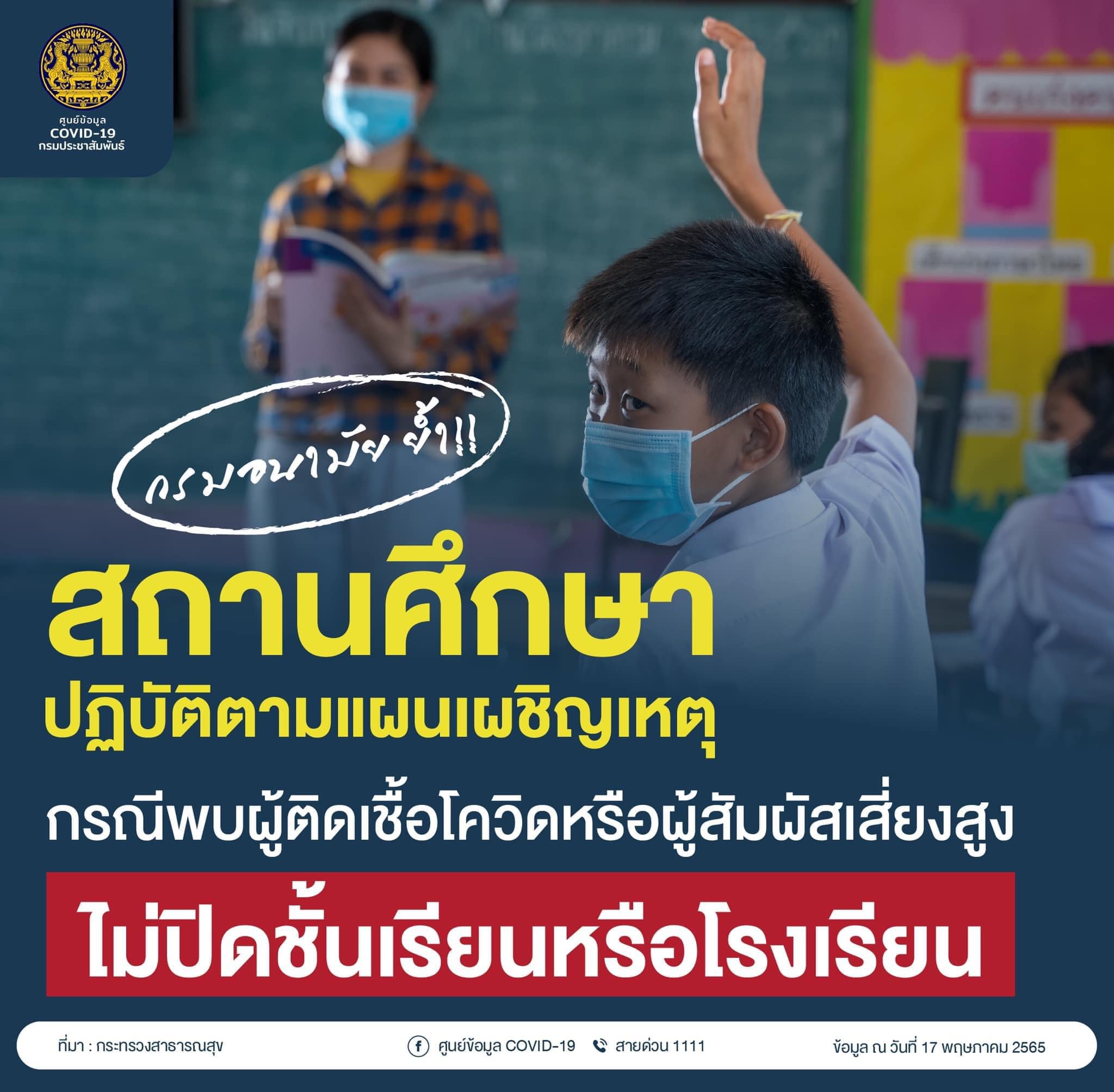 กรมอนามัย ย้ำ !! สถานศึกษาปฏิบัติตามแผนเผชิญเหตุ กรณีพบผู้ติดเชื้อโควิด หรือผู้สัมผัสเสี่ยงสูง ไม่ปิดชั้นเรียนหรือโรงเรียน